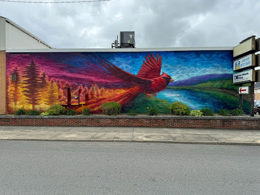 Kelson Thorne has completed multiple murals in Petersburg, WV, but in particular has made a great impact with his work inspired by the wildfires that Grant and Hardy County faced in March of 2024. As Thorne explains, “The mural serves as a metaphor for regrowth and rejuvenation; despite their devastation, wildfires enrich the soil and create new habitats for plants and animals. Witnessing our community unite during such challenging times has deepened my pride in Petersburg.”