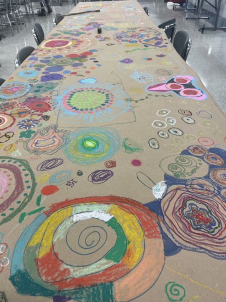 Caitlin, alongside her collaborator, artist Andi Gelsthorpe, organized a group art project with the shelter’s young residents. They laid brown paper sheets on the school’s cafeteria tables and invited impacted youth to express themselves creatively.
